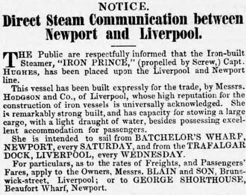 The Iron Prince was a screw steamer built by James Hodgson & Co., Liverpool in 1844 and launched in January 1845. According to the Liverpool Albion newspaper (13th January, 1845) the 55hp, 112ft ship was believed to be 'the first steamer that ever was launched with her machinery, masts, and rigging in their places.