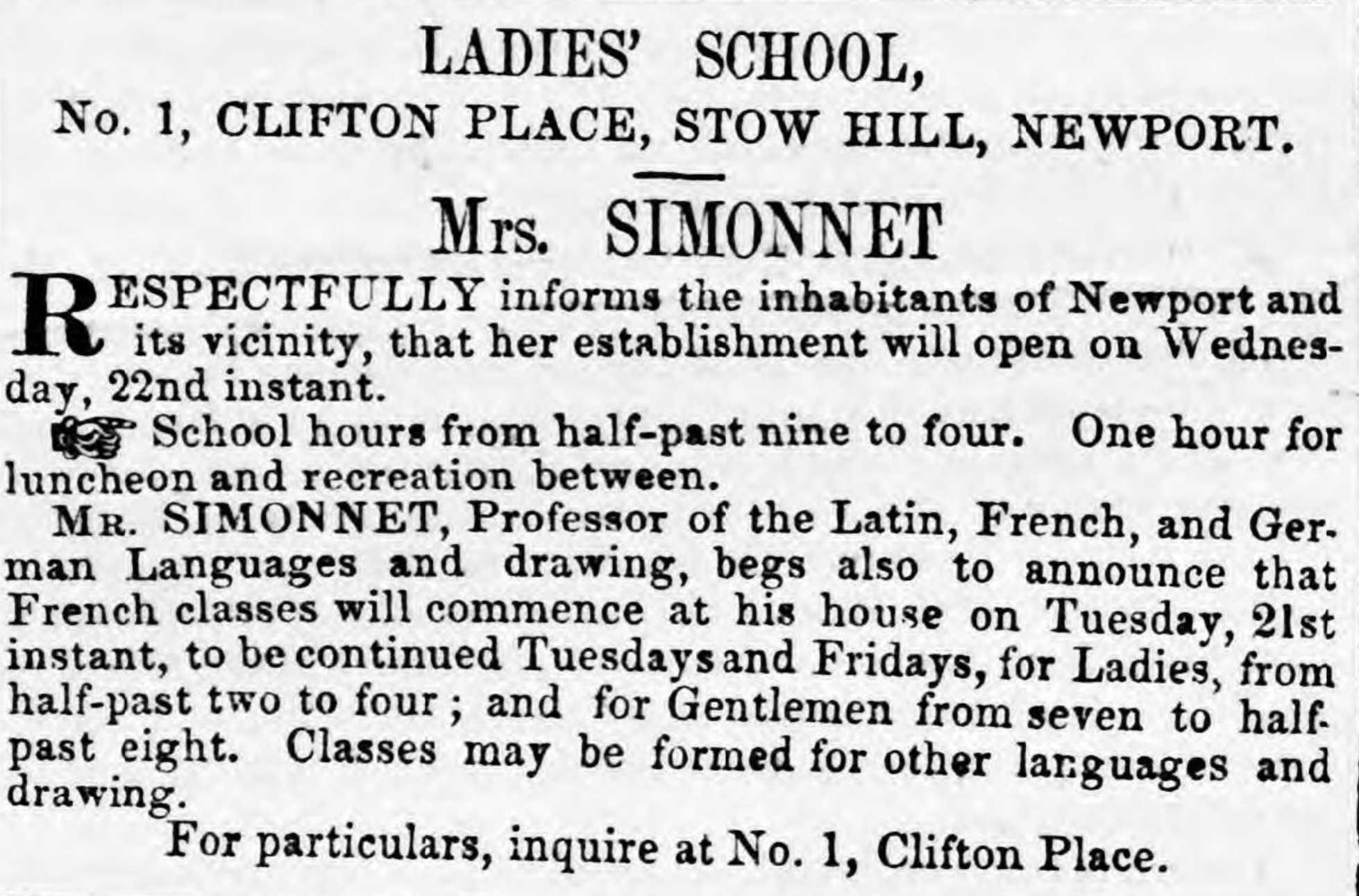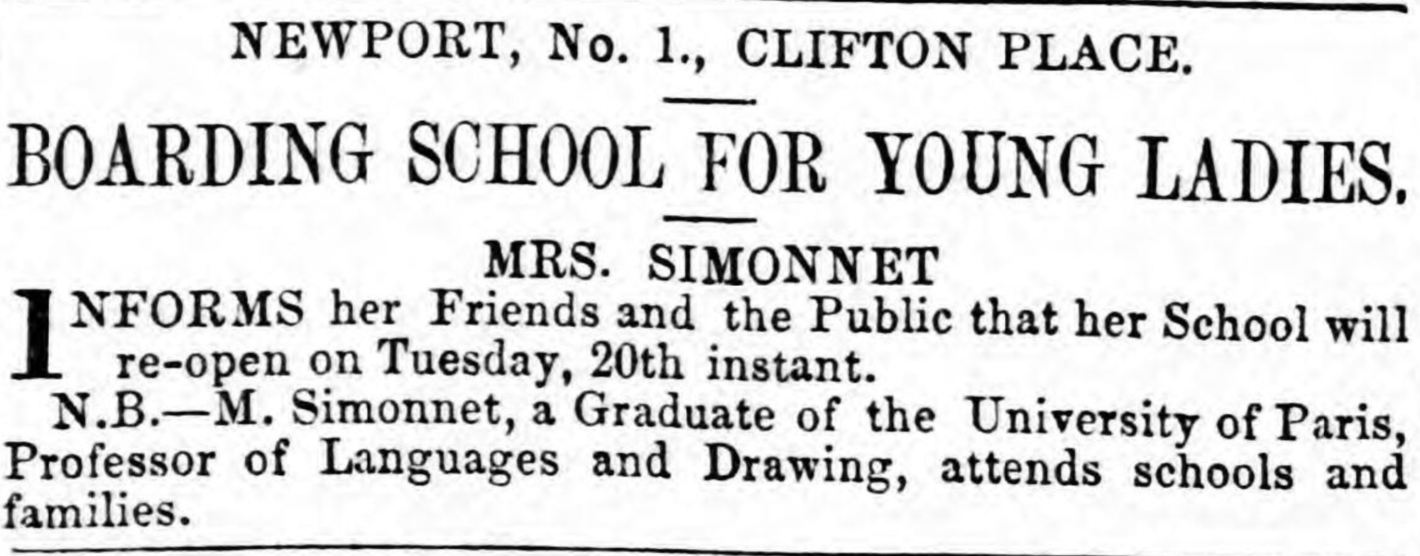 No. 1, Clifton Place in 1846/47 was being run as a 'Boarding School for Young Ladies' by Mrs Simonnet who was a graduate of the University of Paris and a professor of languages and drawing.