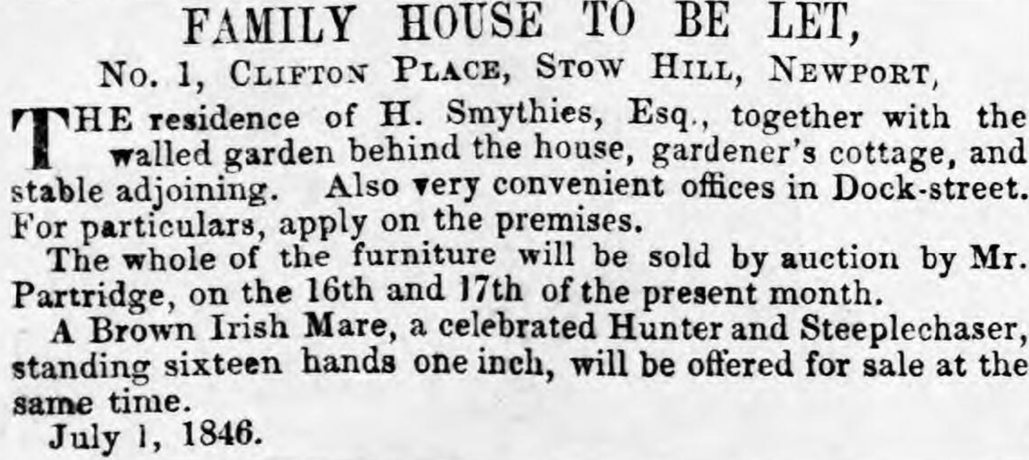 A row of 7 houses (nos. 2-8) on Clifton Place are Grade-II listed with 2—6 dating to the mid 1840s and 7 and 8 from later. The advert in the Monmouthshire Merlin from 1848 list the 'genteel residence' as being newly built. The property had five bedrooms, two parlours, drawing room, two kitchens, larder, cellar and a china closet.