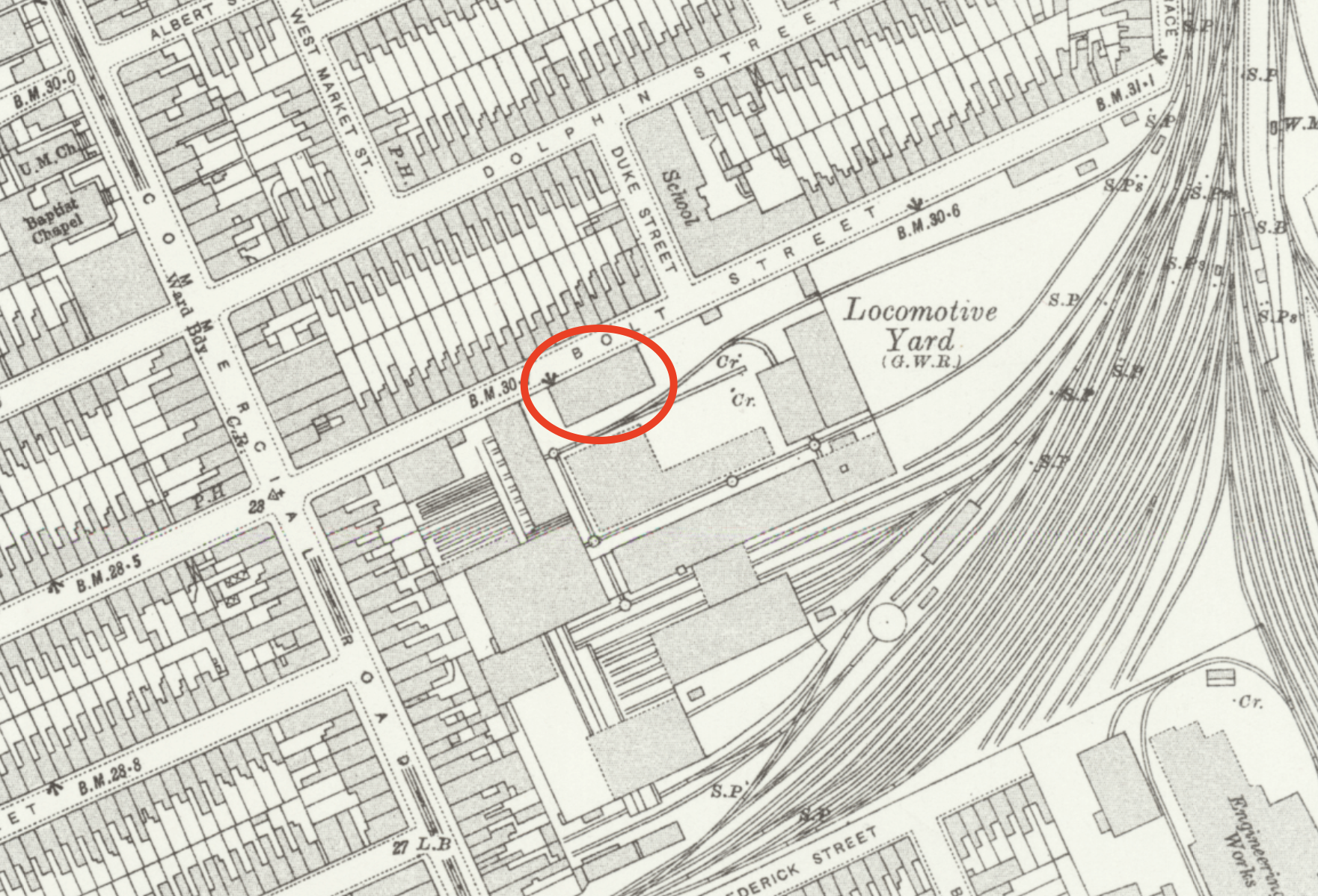 This building on Bolt Street shows on an old map as part of the locomotive yard so may have been built from some of the material moved from the Court-y-Bella station.