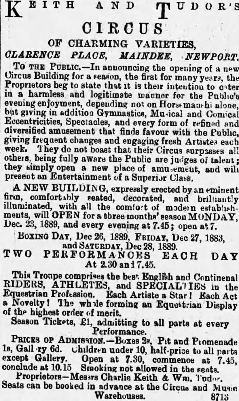For three months, Keith and Tudor's Circus set up a custom building in Clarence Place where gymnastics, music, 'eccentricities' and horse riders entertained people of the town. It was part of an eighteen month tour which also included Yorkshire, Norfolk and Suffolk. The last performance was on 12th April, 1890 and featured 'various contests and a duck hunt'.