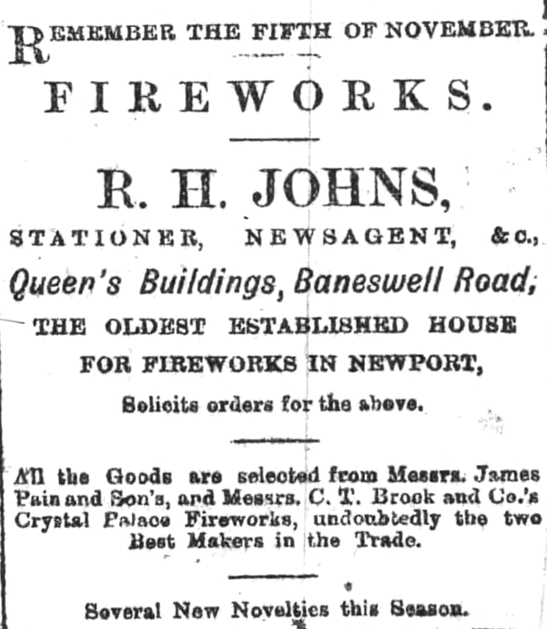 The "5th" was celebrated in Newport with the customary rough and rowdy scenes. Throughout the day the streets were given up to the mercy of fireworks exploding urchins, and between eight and ten at night the spirit of license was fully abroad, and a fusillade of fireworks was kept up in the principal streets. A great crowd blocked the street at the Westgate, and those present amused themselves with discharging squibs and crackers at each other, while numbers of boyd ran along the streets dragging blazing pieces of wood saturated with the tar behind them.