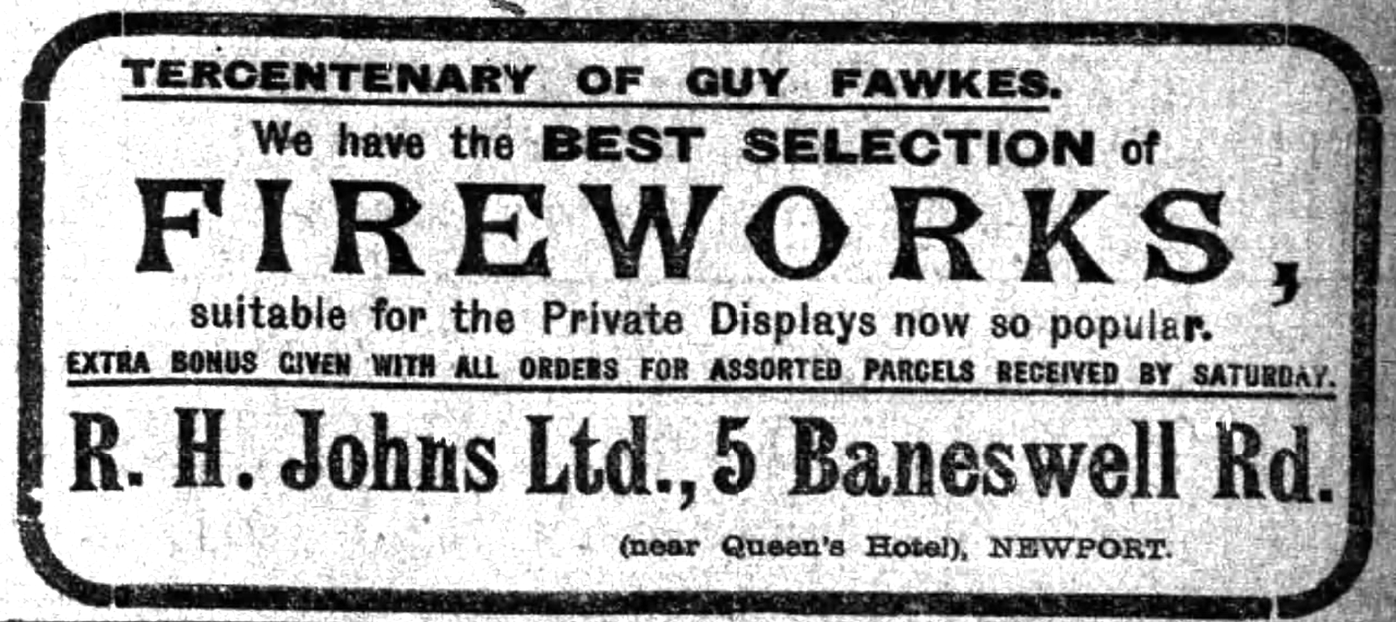 The celebration of the Gunpowder Plot in Newport on Friday was made the occasion for letting off fireworks in the public streets; but compared with former years there was considerably less rowdyism and horse-play. The chief interest of those who took delight in firing squibs, crackers, detonators, and coloured lights, &c., was centred in front of the Westgate Hotel and at the foot of Stow Hill, where between the hours of seven and ten o'clock a large crowds numbering considerably more than a thousand assembled.