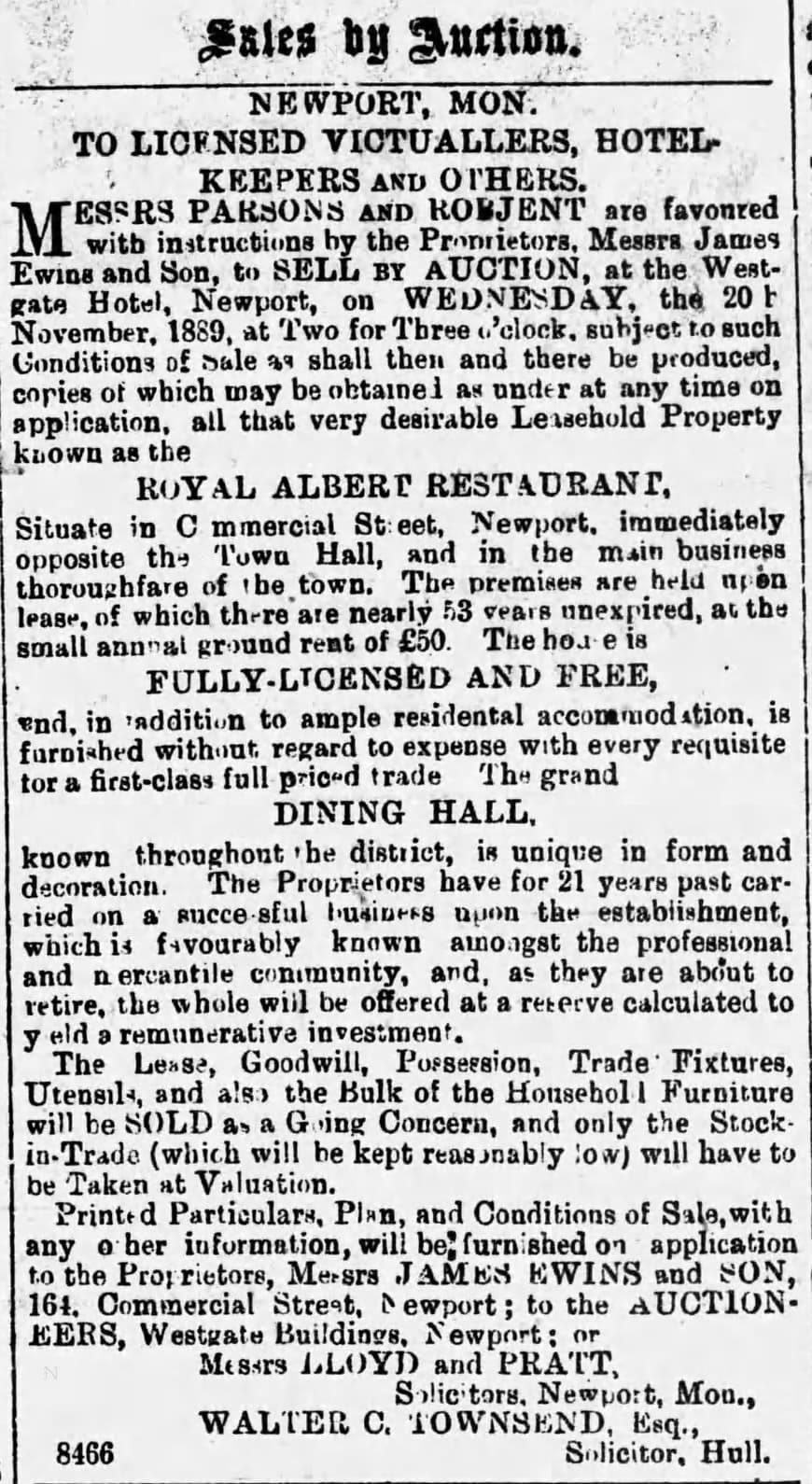 On Wednesday, the 20th November, Mr C. Parsons, of the firm of Parsons and Robjent, will wield the hammer, and if a glib tongue and eloquence are persuasive powers, will knock down, in the event of the reserve price being reached, the Royal Albert Restaurant, for so many years occupied in Commercial-street by Messrs James Ewins and Son.