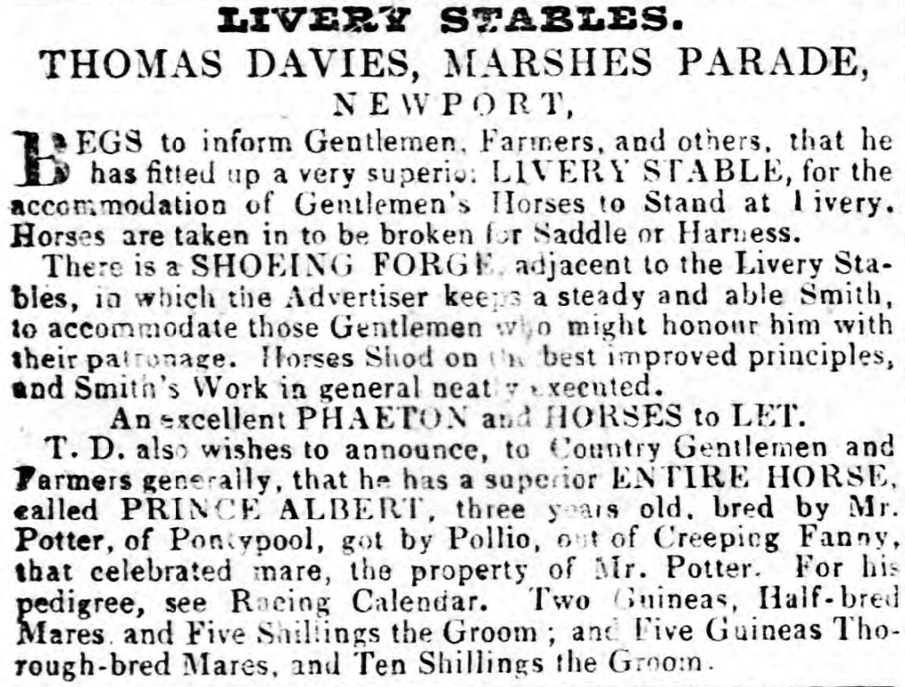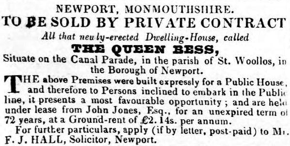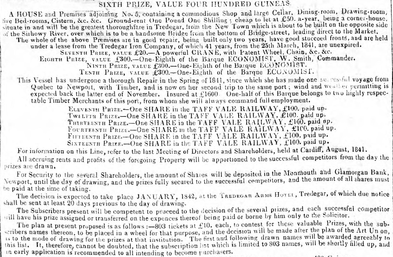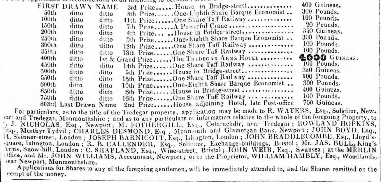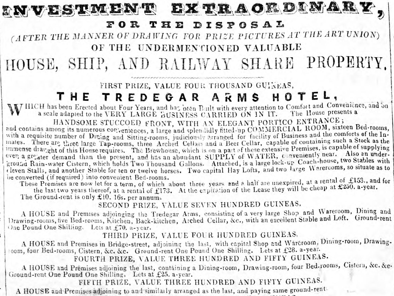 In another column will be found an advertisement announcing the forthcoming disposal of an highly valuable property at Tredegar Iron Works, in this county. The mode proposed is a species of lottery, the price of each share being fixed at ten pounds. The property is divided into convenient lots, all highly improvable. One prize is of no less value than 4000 guineas, this being the Tredegar Arms Inn, Tredegar, one of the best circumstanced inns in the county. The winner of this prize, will have good value for his ten pound ticket. There are many other prizes for large amounts.