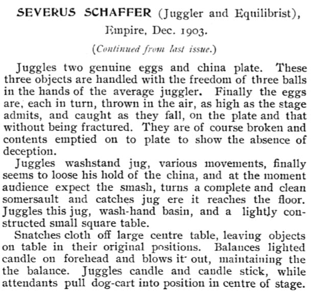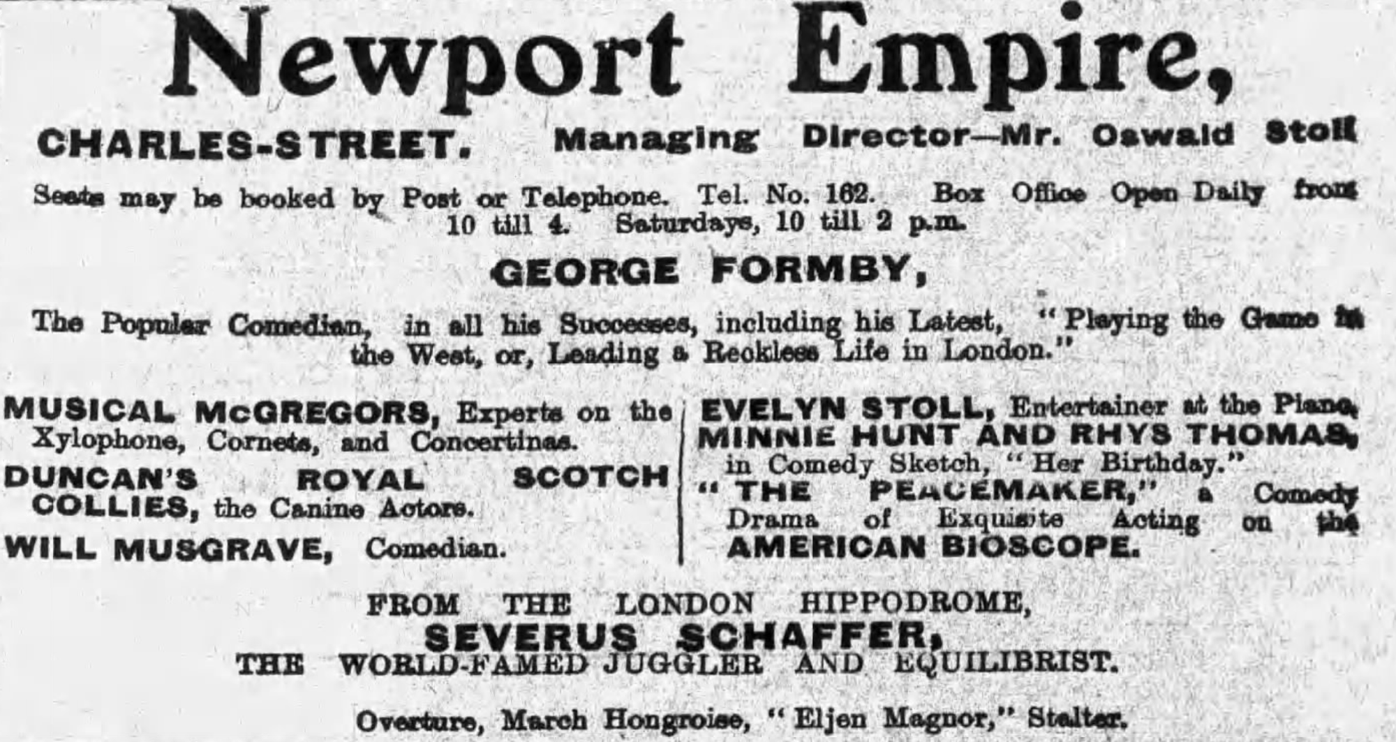 Appearing at the Newport Empire in November, 1910 (alongside George Formby Senior) was Severus Schaffer, a world-famed juggler. He also returned to the Empire in 1930.