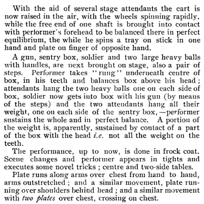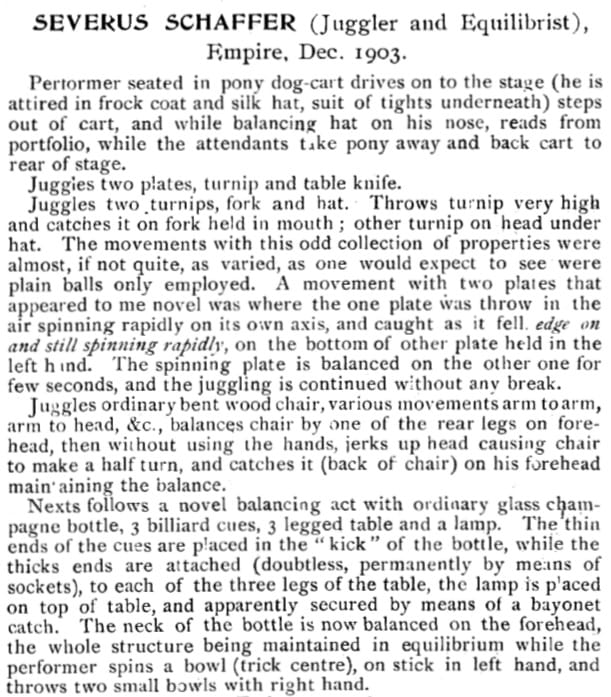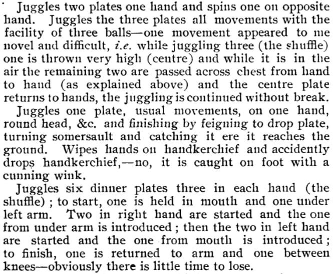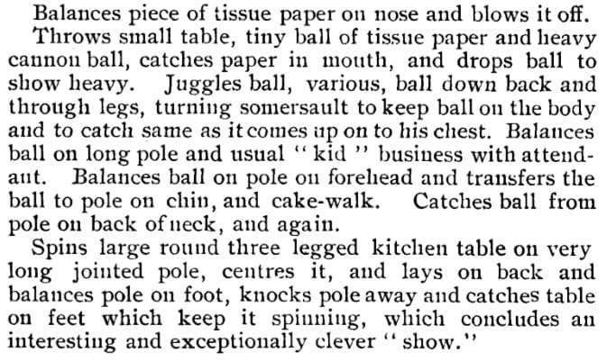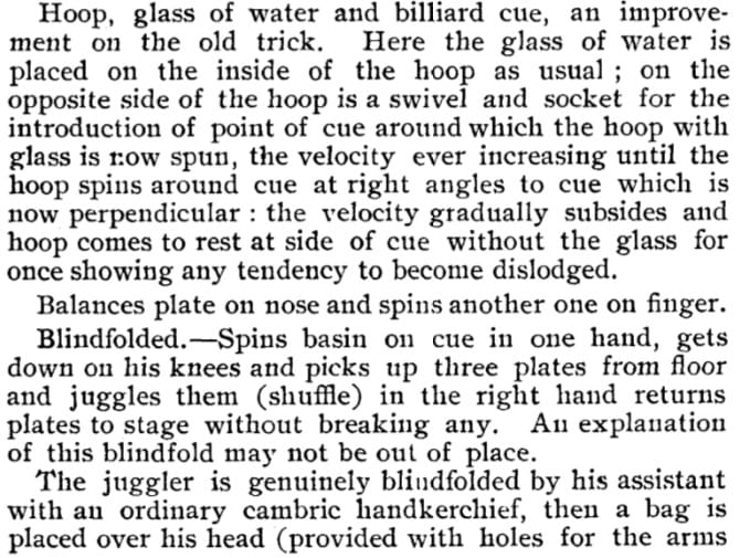 Throughout the late nineteenth and early twentieth century he earned glowing reviews, routinely topping theatre bills and being hailed as “King of Jugglers” or “The World’s Greatest Juggler,” with a 1903 account in Ellis Stanyon’s Magic Magazine offering one of the fullest descriptions of his act.