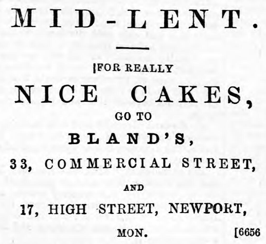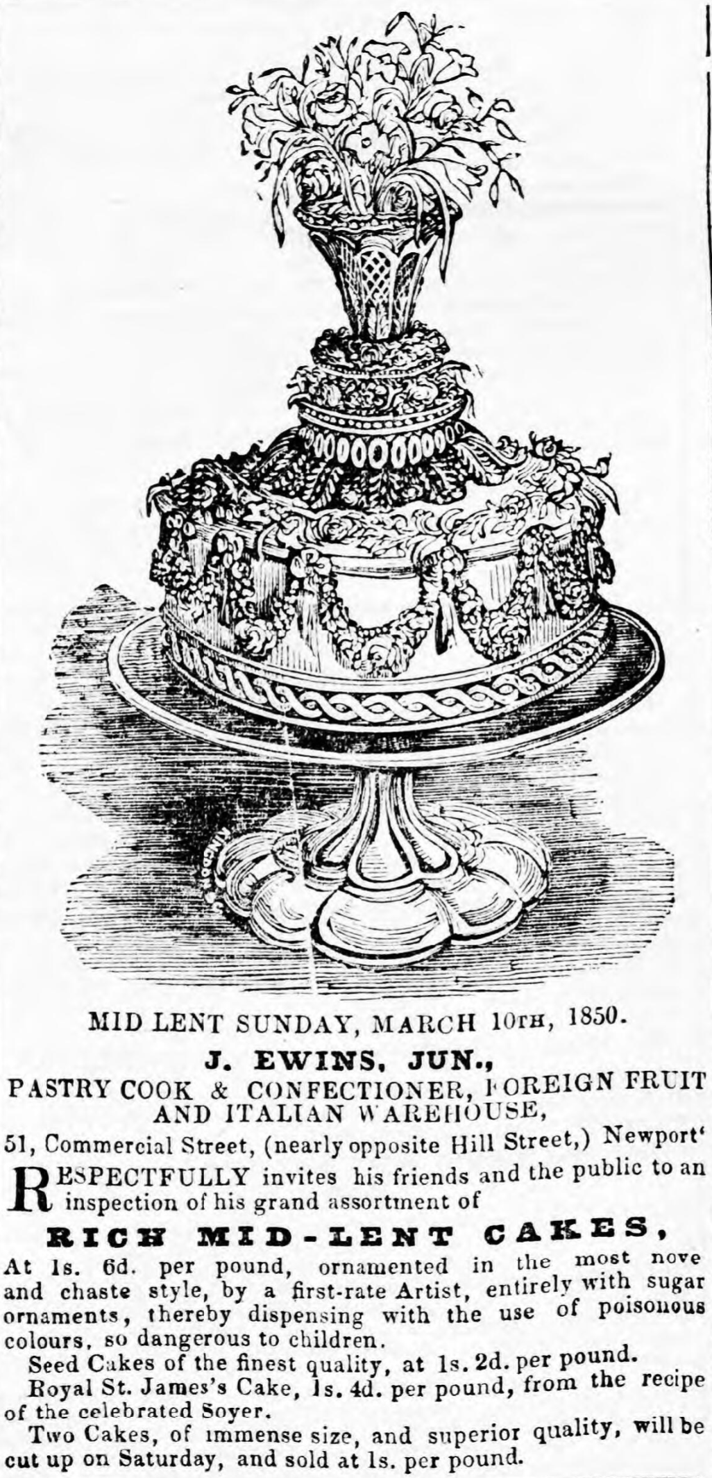 The return of Lent, which is always productive of an active competition among the confectioners of Newport, to provide the very best of mothering cakes for the juveniles, has this year tested the utmost skill of the sweet caterers. The establishment of Mr. James Ewins, Commercial-street, was, however, the chief scene of attraction, where monster cakes, most tastefully ornamented