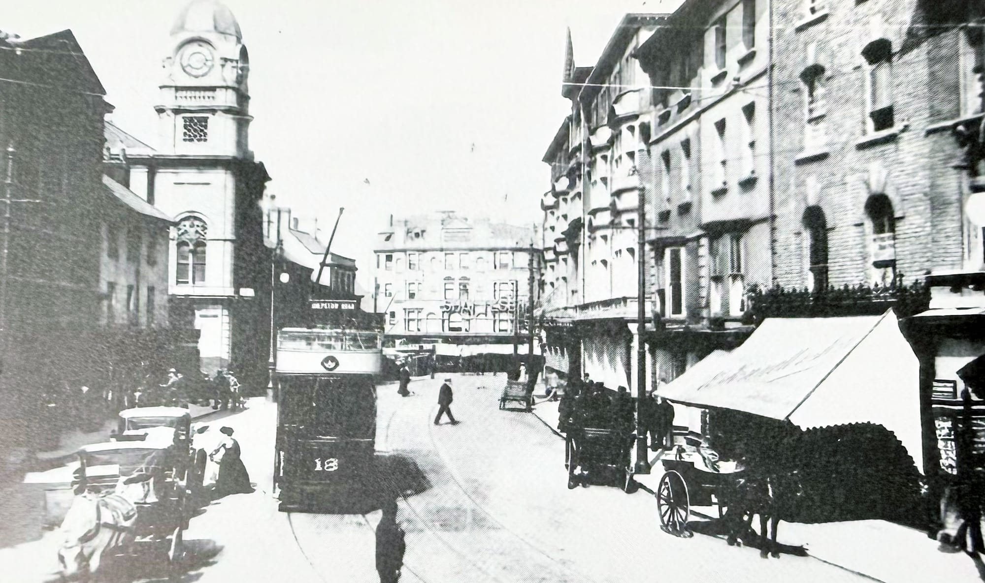 Considerable attention was paid to house embellishment and displays, more or less extensive, of bunting were to be seen in most parts of the town. At the station entrance hung a string of handsome flags, the centre one bearing the inscription "Welcome to our Townsman's bride" while banners were shown from the King's Head Hotel and other buildings in the vicinity. But it was between the New Entrance and Bryn Glas that the decorators had bestowed their most successful efforts. An arch of evergreens and flowers was erected near the Castle Brewery and the front of the railway bridge lower down the road was completely hidden by a wealth of foliage and flowers, the design being surmounted by a scroll on which were the words "Long life and happiness to the Squire of Bryn Glas and his bride."