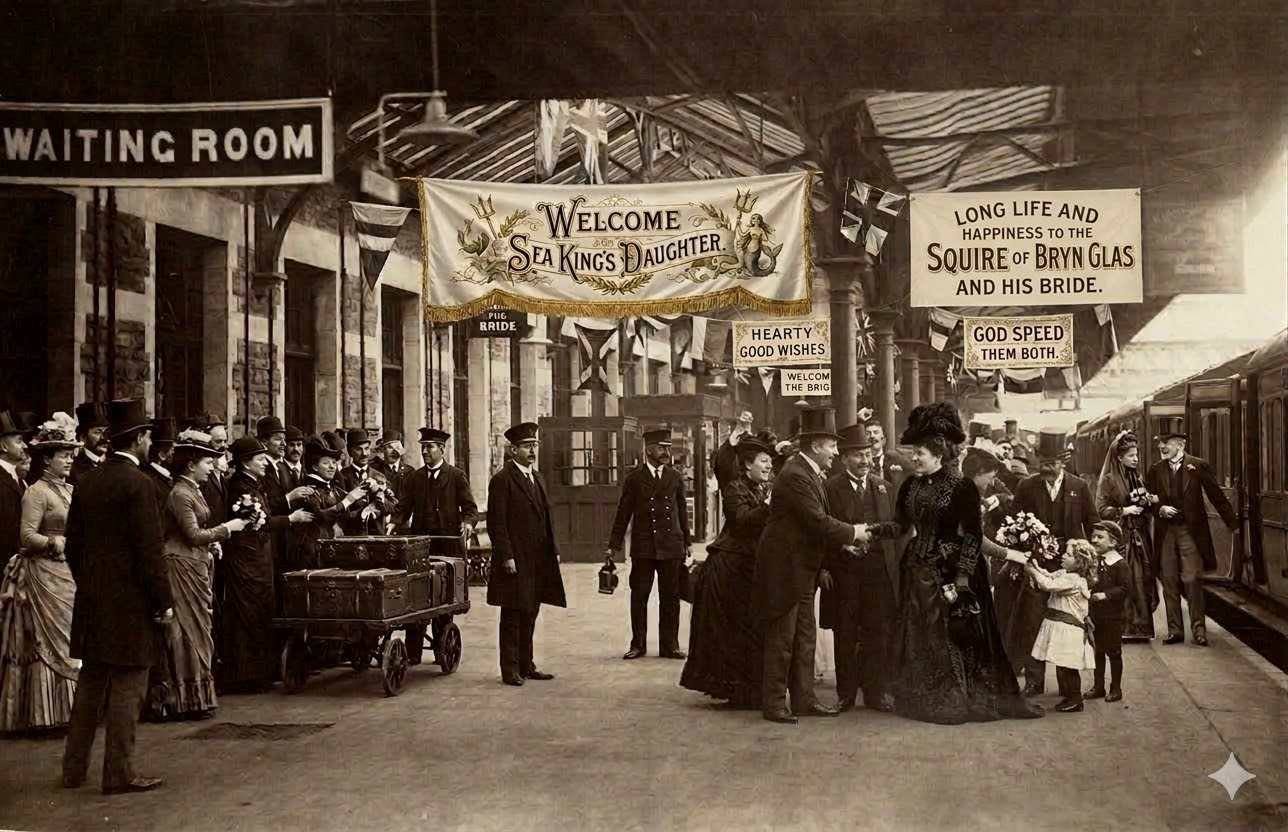 Many of the residences hereabouts displayed flags, most of them bearing mottoes such as "Welcome the bride," "Welcome Sea King's daughter, May they be happy," "Hearty good wishes," "God speed them both," &c. Near the Wesleyan chapel a row of flags waved across the road, and on the middle a banner appeared the lines (evidently suggested by a verse of the "National Anthem,")