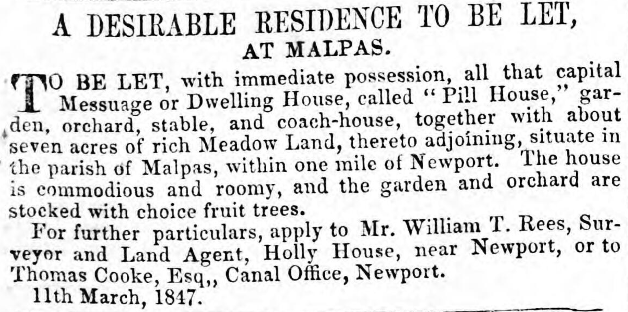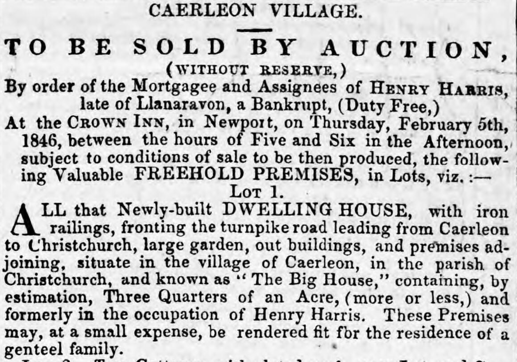 An advert appeared in the Monmouthshire Merlin in the middle of the 1840s (1844-1847) for a property in Caerleon called 'The Big House'. It was described as fronting the Caerleon to Christchurch toll road and having an iron railing in front.
