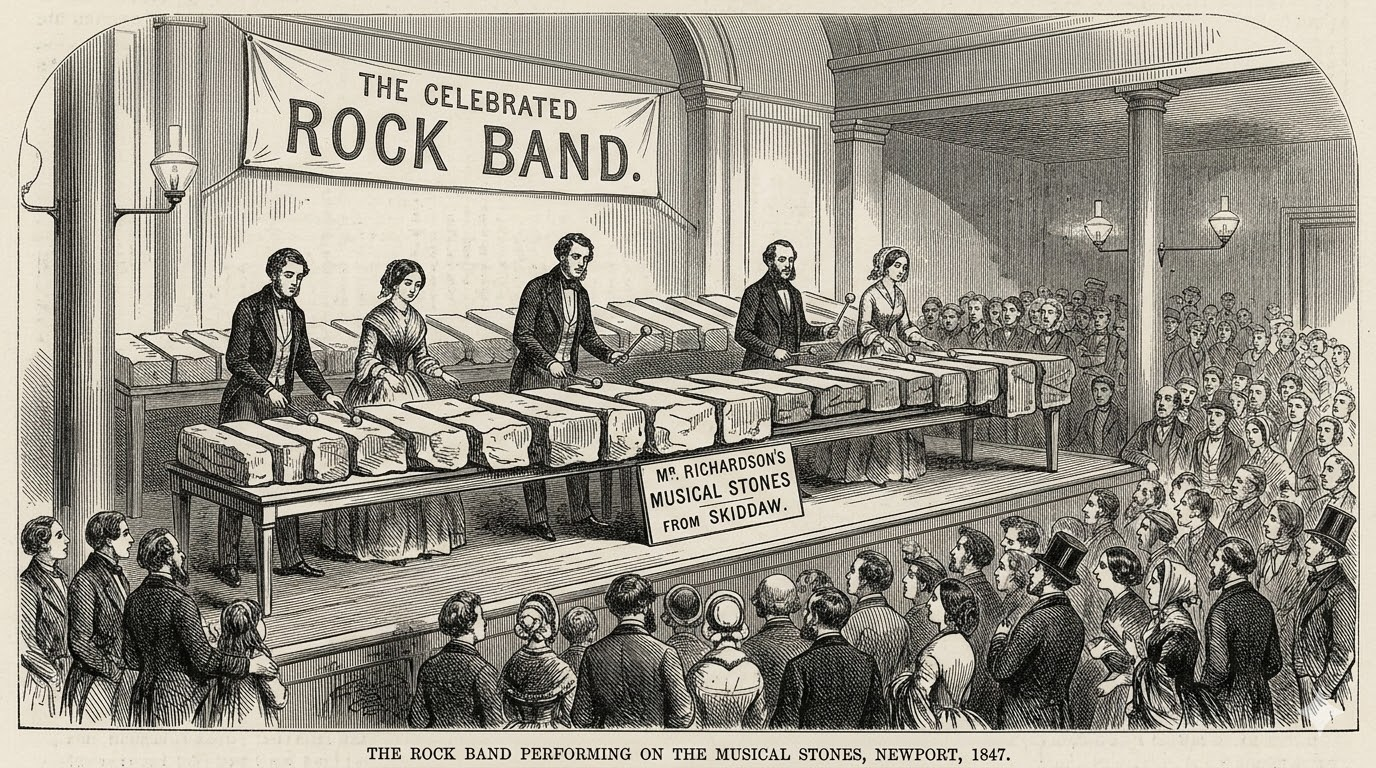 "For the information of our readers, to whom the Rock Band is unknown, we may just state that some years since, Mr Richardson accidentally discovered that certain stones in the neighbourhood of Keswick produced tones of great beauty and power. To apply this discovery, he toiled for years in the adjustment of fragments from Skiddaw, and the result of his labours is the construction of instruments, for so they may be called, which have a compass of 7 or 8 octaves; and from these uncouth blocks of stone is produced the most exquisite music that we have ever heard. These masses of stone, which vary in length from five feet to six inches, are arranged in two rows after the manner of the key board of an organ, and produce a variety of sounds, which seem to us to bear much resemblance to the tones of the harp, violoncello, and bass. At times we thought we were listening to some huge musical snuff box, so rapid was touch of the players, and sustained the effect."