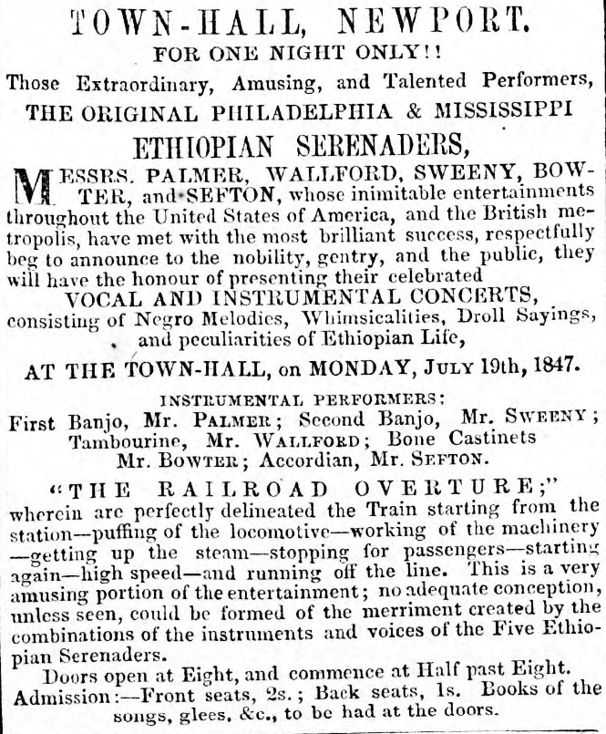 They performed at the Town Hall for one night and featured 'Negro Melodies, Whimsicalities, Droll Sayings, and peculiarities of Ethiopian Life'.